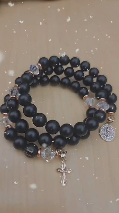 "Protect yourself from negative energy with our Rosary Wrap Around Bracelet. Made with 8mm matte black onyx gemstones and mixed metals, including stainless steel gold plated memory wire and copper beads for added energy. Featuring a pure 10k gold prayer crucifix and Blessed Virgin Mary charms, this bracelet is both stylish and powerful."